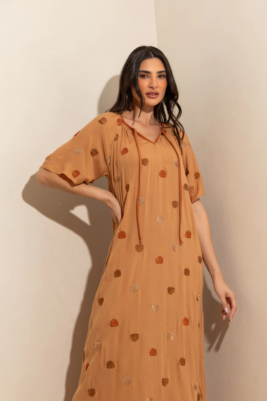 Disponível em cores, o tecido conta com um bordados de conchas: marrom e preto